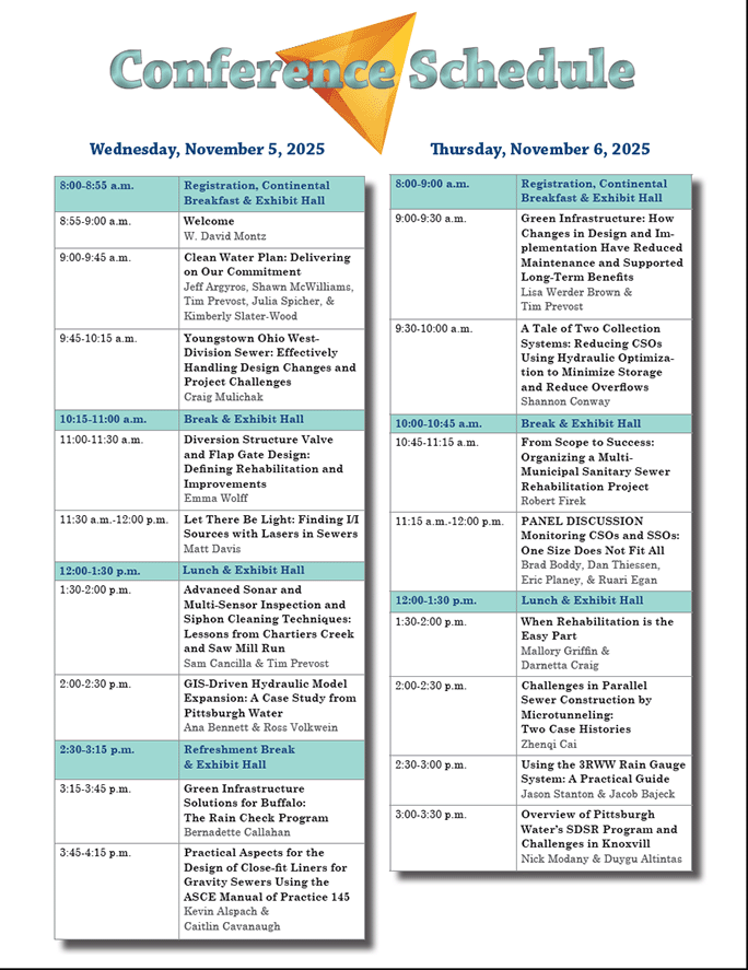 Each year more than 400 municipal officials, engineers, managers, public works directors and wet weather experts attend the 3 Rivers Wet Weather Sewer Conference to learn, educate and share experiences for overcoming the wet weather problems that have plagued the Pittsburgh region for decades. More than 90 exhibitors share their products and services while local, regional and national speakers present educational sessions on a variety of wet weather issues. The conference spans both the North and South Halls, which provides spacious accommodations for both the educational sessions as well as the exhibit hall.