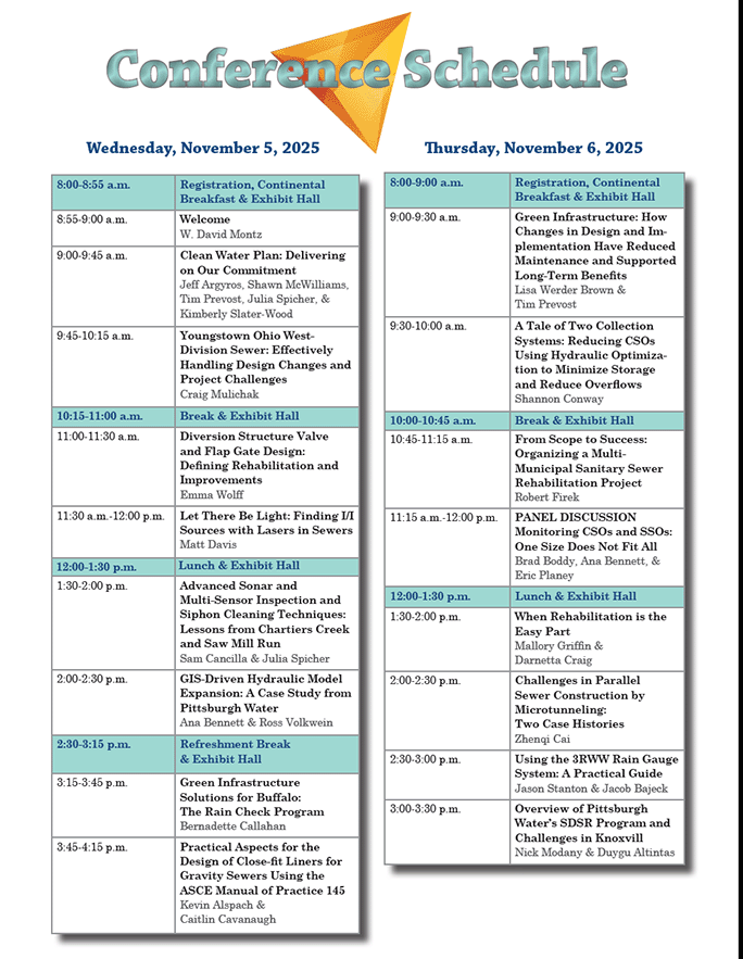 Each year more than 400 municipal officials, engineers, managers, public works directors and wet weather experts attend the 3 Rivers Wet Weather Sewer Conference to learn, educate and share experiences for overcoming the wet weather problems that have plagued the Pittsburgh region for decades. More than 90 exhibitors share their products and services while local, regional and national speakers present educational sessions on a variety of wet weather issues. The conference spans both the North and South Halls, which provides spacious accommodations for both the educational sessions as well as the exhibit hall.